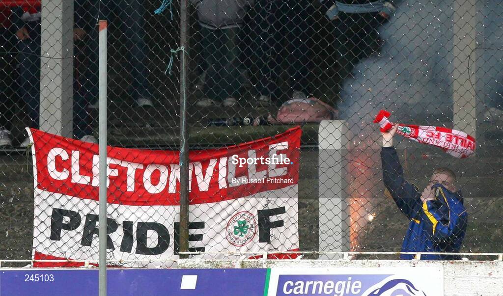 21 April 2007; A masked Cliftonville supporter waves a scarf after setting off a firework. Carnegie Premier League, Cliftonville v Glentoran, Solitude, Belfast, Co. Antrim. Picture credit; Russell Pritchard / SPORTSFILE