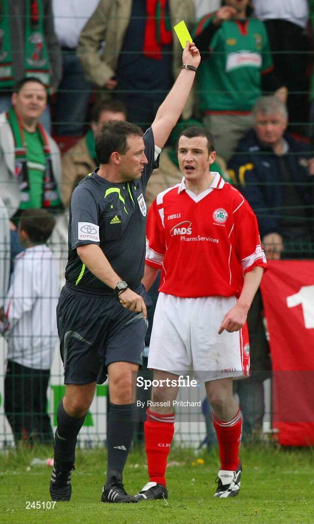 21 April 2007; Liam Fleming, Cliftonville, is shown a yellow card from referee Adrian McCourt. Carnegie Premier League, Cliftonville v Glentoran, Solitude, Belfast, Co. Antrim. Picture credit; Russell Pritchard / SPORTSFILE