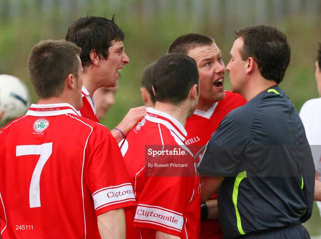 21 April 2007; Referee Adrian McCourt gets surrounded by Cliftonville players after he gave a penalty against them. Carnegie Premier League, Cliftonville v Glentoran, Solitude, Belfast, Co. Antrim. Picture credit; Russell Pritchard / SPORTSFILE