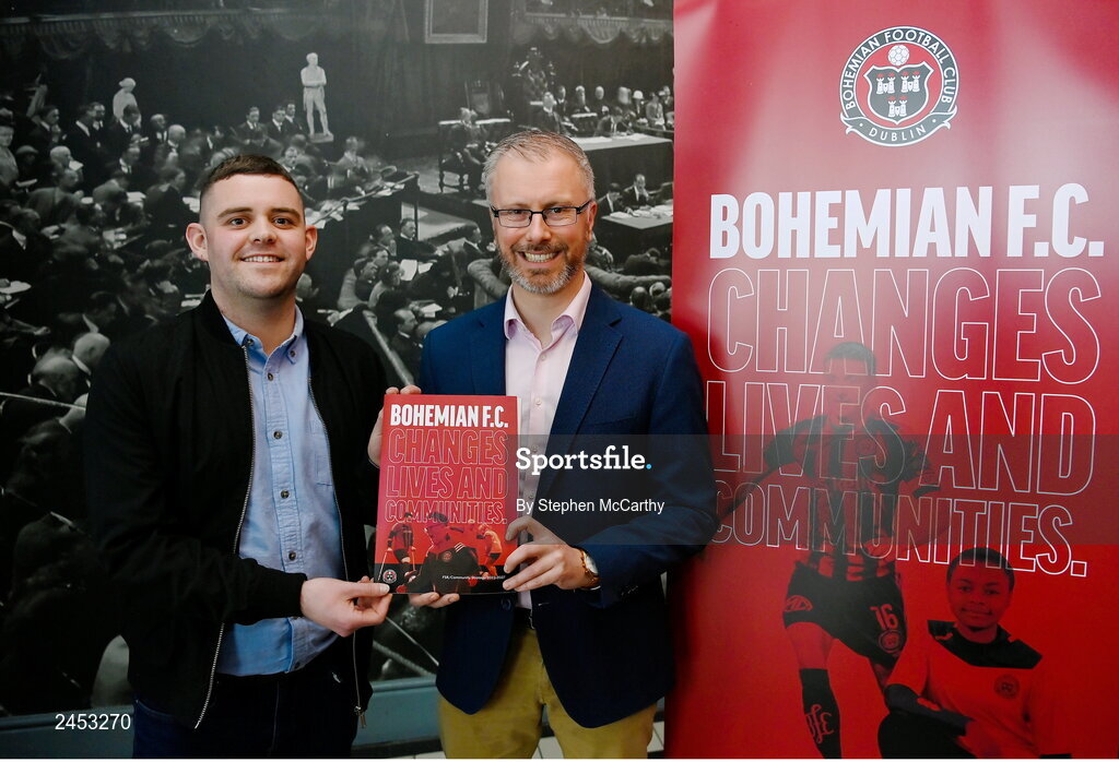 13 March 2023; Roderic O'Gorman TD, Minister for children, equality, disability, integration and youth, and James Flanagan, football social responsibility manager, Bohemian Football Club, left, during the launch of Bohemian FC's Football Social Responsibility and Community Strategy at the Mansion House in Dublin. Photo by Stephen McCarthy/Sportsfile