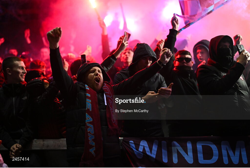 16 March 2023; Drogheda United supporters before the SSE Airtricity Men's Premier Division match between Drogheda United and Dundalk at Weavers Park in Drogheda, Louth. Photo by Stephen McCarthy/Sportsfile