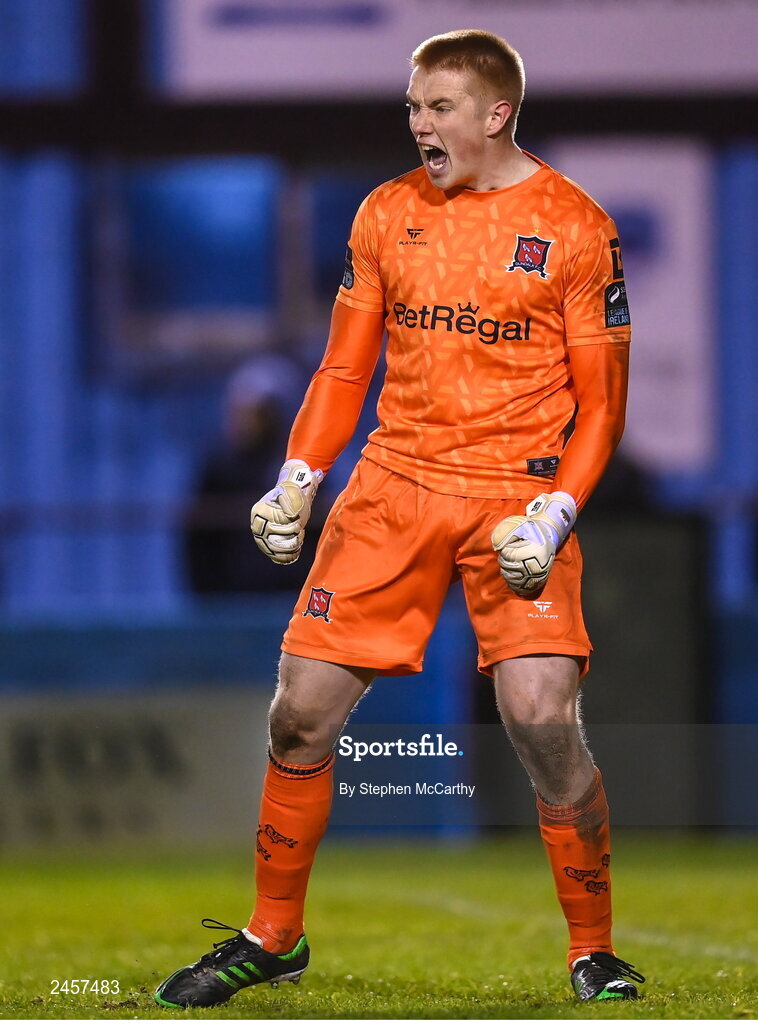 16 March 2023; Dundalk goalkeeper Nathan Shepperd celebrates at the final whistle of the SSE Airtricity Men's Premier Division match between Drogheda United and Dundalk at Weavers Park in Drogheda, Louth. Photo by Stephen McCarthy/Sportsfile