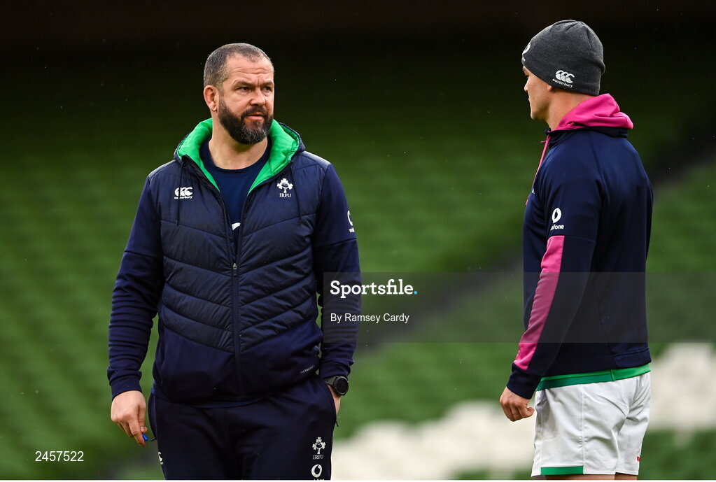 17 March 2023; Head coach Andy Farrell, left, and captain Jonathan Sexton during the Ireland rugby captain's run at the Aviva Stadium in Dublin. Photo by Ramsey Cardy/Sportsfile
