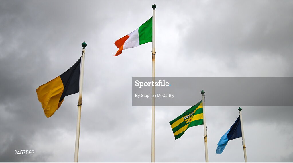 17 March 2023; The Irish tricolour flies alongside flags representing, from left, St Eunan's GAA Club, Donegal and Dublin before the Lidl Ladies National Football League Division 1 match between Donegal and Dublin at O’Donnell Park in Letterkenny, Donegal. Photo by Stephen McCarthy/Sportsfile