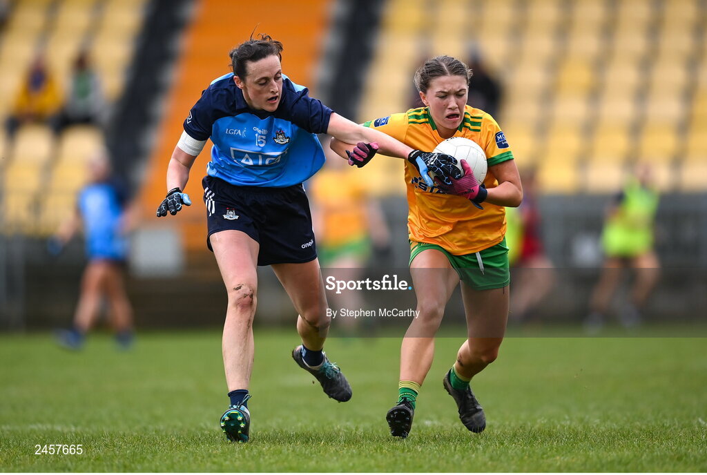 17 March 2023; Tara Hegarty of Donegal is tackled by Hannah Tyrrell of Dublin during the Lidl Ladies National Football League Division 1 match between Donegal and Dublin at O’Donnell Park in Letterkenny, Donegal. Photo by Stephen McCarthy/Sportsfile