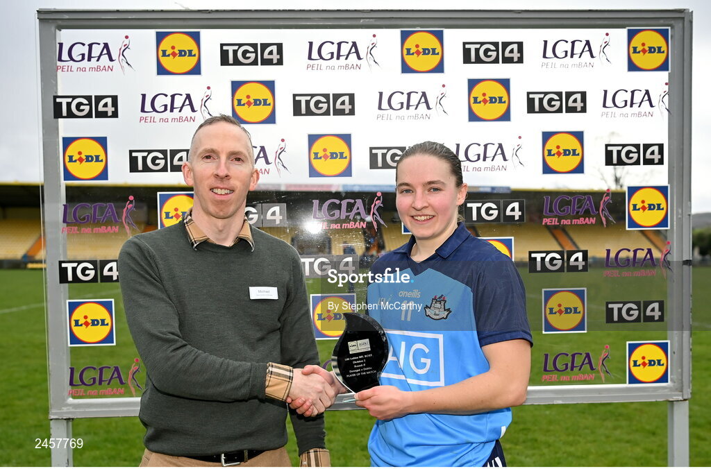 17 March 2023; Orlagh Nolan of Dublin in presented with the Player of the Match award by Michael McGrory, Sales Operation Manager, Lidl Ireland, following the Lidl Ladies National Football League Division 1 match between Donegal and Dublin at O’Donnell Park in Letterkenny, Donegal. Photo by Stephen McCarthy/Sportsfile