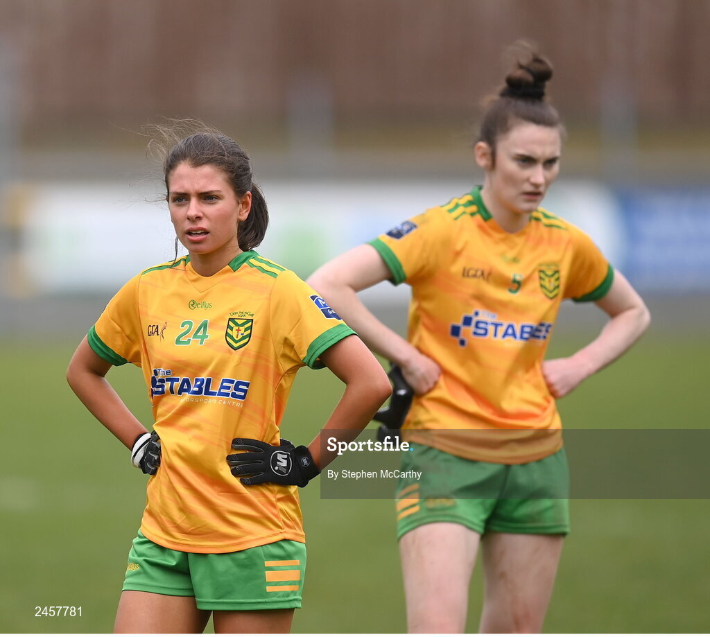 17 March 2023; Codie Walsh, left, and Roisin Rodgers of Donegal after the Lidl Ladies National Football League Division 1 match between Donegal and Dublin at O’Donnell Park in Letterkenny, Donegal. Photo by Stephen McCarthy/Sportsfile