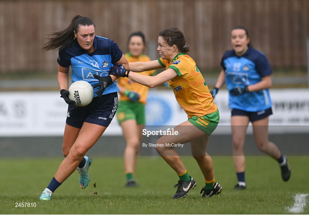 17 March 2023; Niamh Hetherton of Dublin in action against Katie Dowds of Donegal during the Lidl Ladies National Football League Division 1 match between Donegal and Dublin at O’Donnell Park in Letterkenny, Donegal. Photo by Stephen McCarthy/Sportsfile