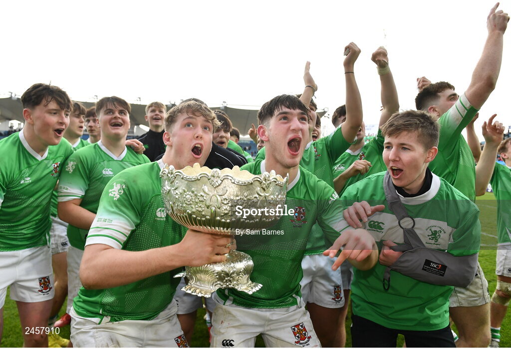 17 March 2023; Gonzaga College players including Tom Myley, centre left, and Morgan Tyrrell, centre right, celebrate with cup after their side's victory in the Bank of Ireland Leinster Schools Senior Cup Final match between Gonzaga College and Blackrock Collegee at RDS Arena in Dublin. Photo by Sam Barnes/Sportsfile