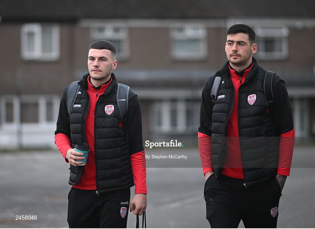 17 March 2023; Ryan Graydon, left, and Cian Kavanagh of Derry City arrive for the SSE Airtricity Men's Premier Division match between Derry City and Sligo Rovers at The Ryan McBride Brandywell Stadium in Derry. Photo by Stephen McCarthy/Sportsfile