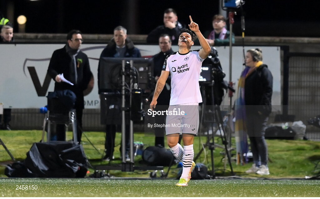 17 March 2023; Max Mata of Sligo Rovers celebrates after scoring his side's first goal during the SSE Airtricity Men's Premier Division match between Derry City and Sligo Rovers at The Ryan McBride Brandywell Stadium in Derry. Photo by Stephen McCarthy/Sportsfile