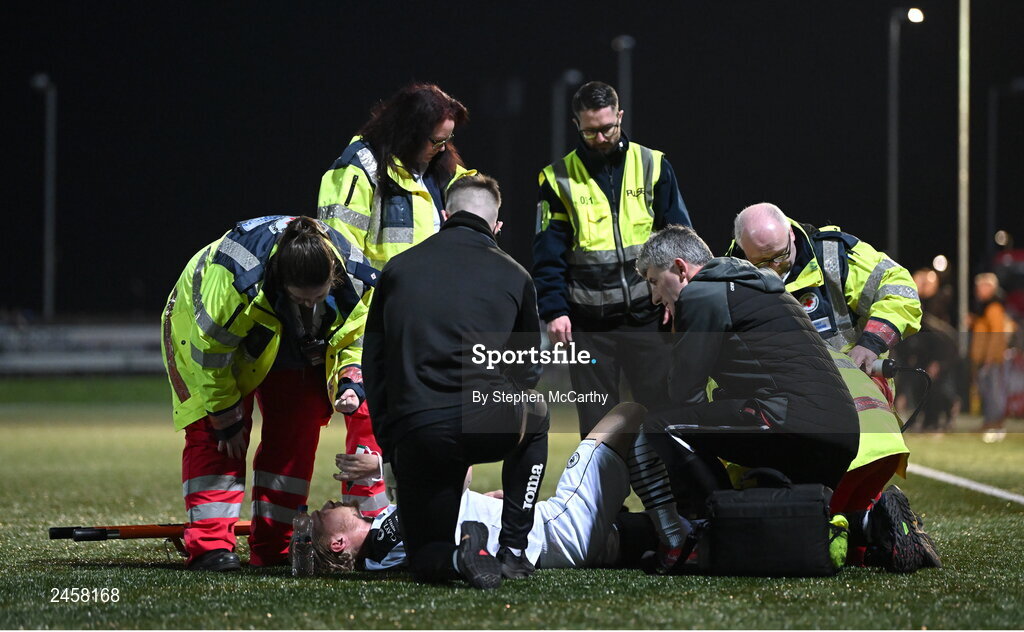 17 March 2023; John Brannefalk of Sligo Rovers receives medical attention during the SSE Airtricity Men's Premier Division match between Derry City and Sligo Rovers at The Ryan McBride Brandywell Stadium in Derry. Photo by Stephen McCarthy/Sportsfile