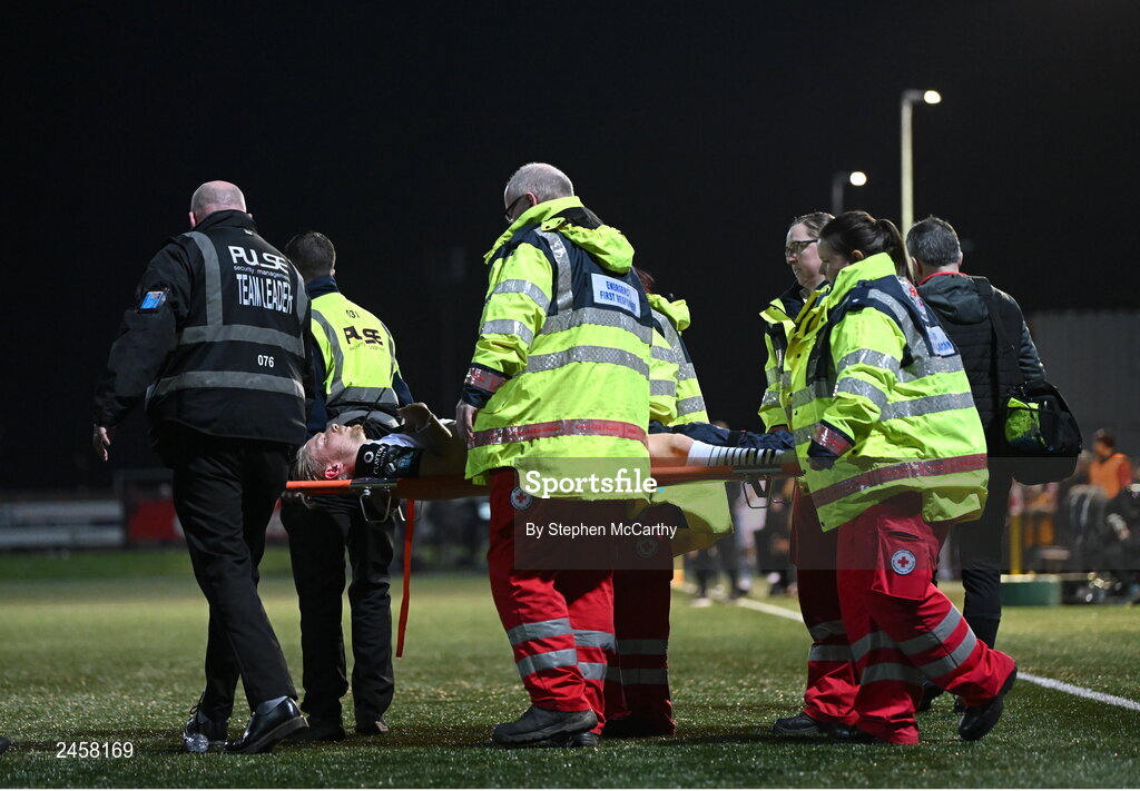 17 March 2023; John Brannefalk of Sligo Rovers leaves the pitch to receive further medical attention during the SSE Airtricity Men's Premier Division match between Derry City and Sligo Rovers at The Ryan McBride Brandywell Stadium in Derry. Photo by Stephen McCarthy/Sportsfile