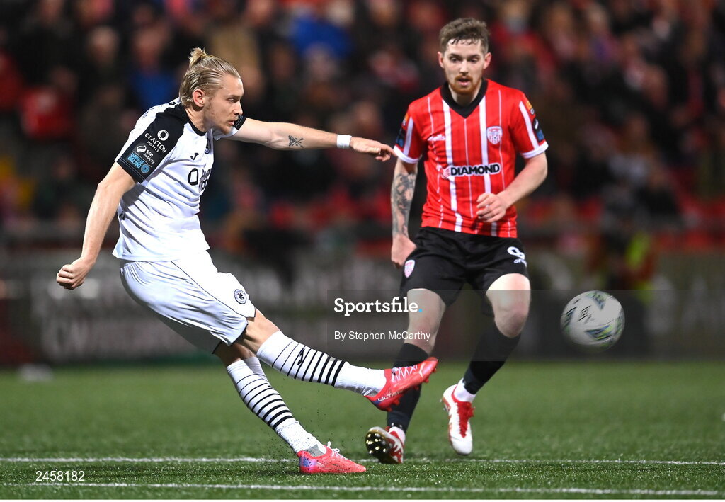 17 March 2023; John Brannefalk of Sligo Rovers in action against Jamie McGonigle of Derry City during the SSE Airtricity Men's Premier Division match between Derry City and Sligo Rovers at The Ryan McBride Brandywell Stadium in Derry. Photo by Stephen McCarthy/Sportsfile