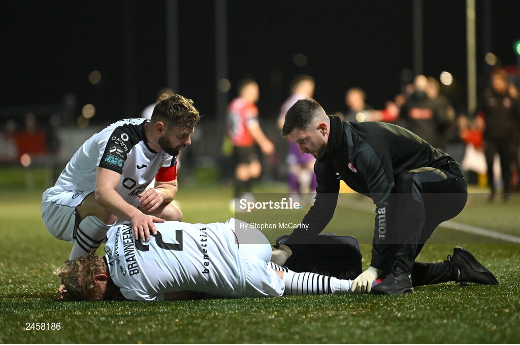 17 March 2023; John Brannefalk of Sligo Rovers is attended to by physiotherapist Cian McBride as team-mate Greg Bolger comforts him during the SSE Airtricity Men's Premier Division match between Derry City and Sligo Rovers at The Ryan McBride Brandywell Stadium in Derry. Photo by Stephen McCarthy/Sportsfile