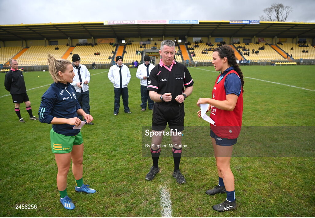 17 March 2023; Referee Anthony Marron with Donegal captain Niamh McLaughlin and Dublin captain Leah Caffrey before the Lidl Ladies National Football League Division 1 match between Donegal and Dublin at O’Donnell Park in Letterkenny, Donegal. Photo by Stephen McCarthy/Sportsfile