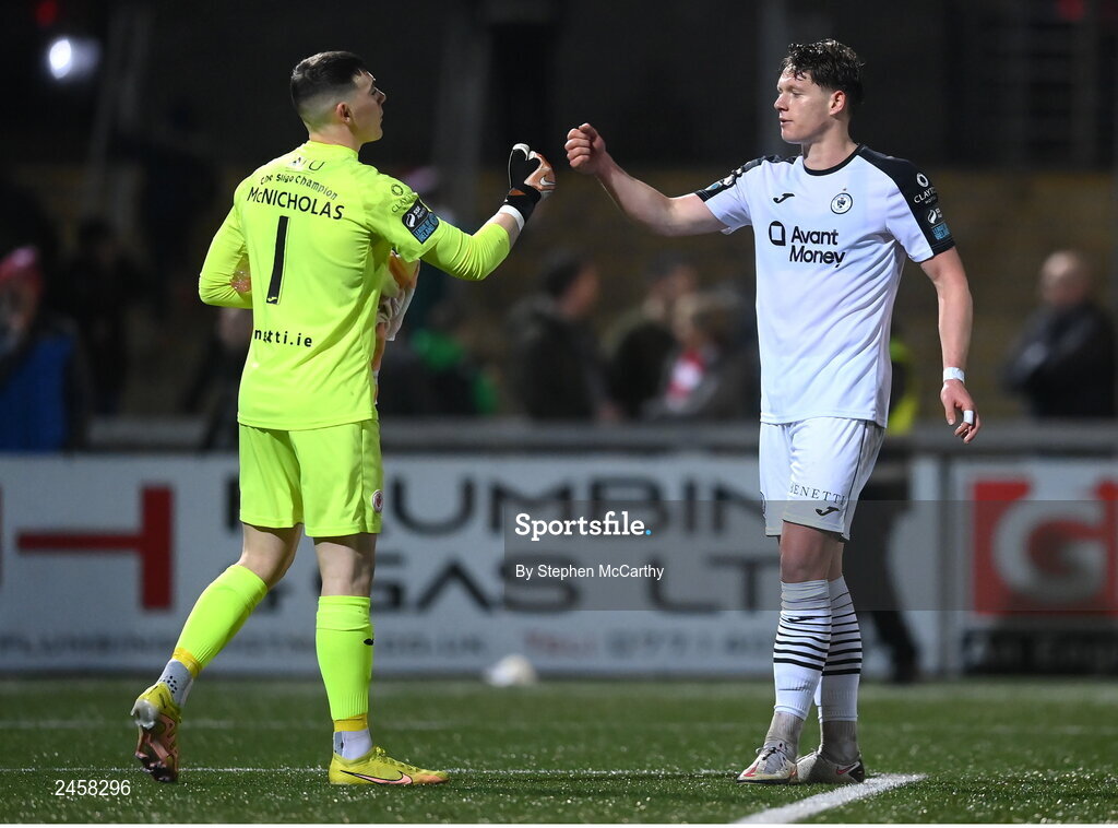 17 March 2023; Sligo Rovers goalkeeper Luke McNicholas and Nando Pijnaker after the SSE Airtricity Men's Premier Division match between Derry City and Sligo Rovers at The Ryan McBride Brandywell Stadium in Derry. Photo by Stephen McCarthy/Sportsfile