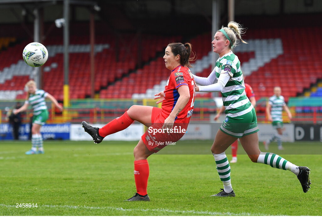 18 March 2023; Noelle Murray of Shelbourne in action against Shauna Fox of Shamrock Rovers during the SSE Airtricity Women's Premier Division match between Shelbourne and Shamrock Rovers at Tolka Park in Dublin. Photo by Tyler Miller/Sportsfile