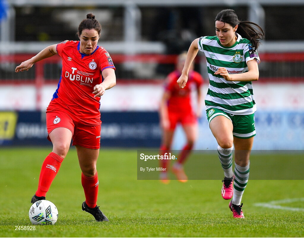 18 March 2023; Noelle Murray of Shelbourne in action against Aoife Kelly of Shamrock Rovers during the SSE Airtricity Women's Premier Division match between Shelbourne and Shamrock Rovers at Tolka Park in Dublin. Photo by Tyler Miller/Sportsfile