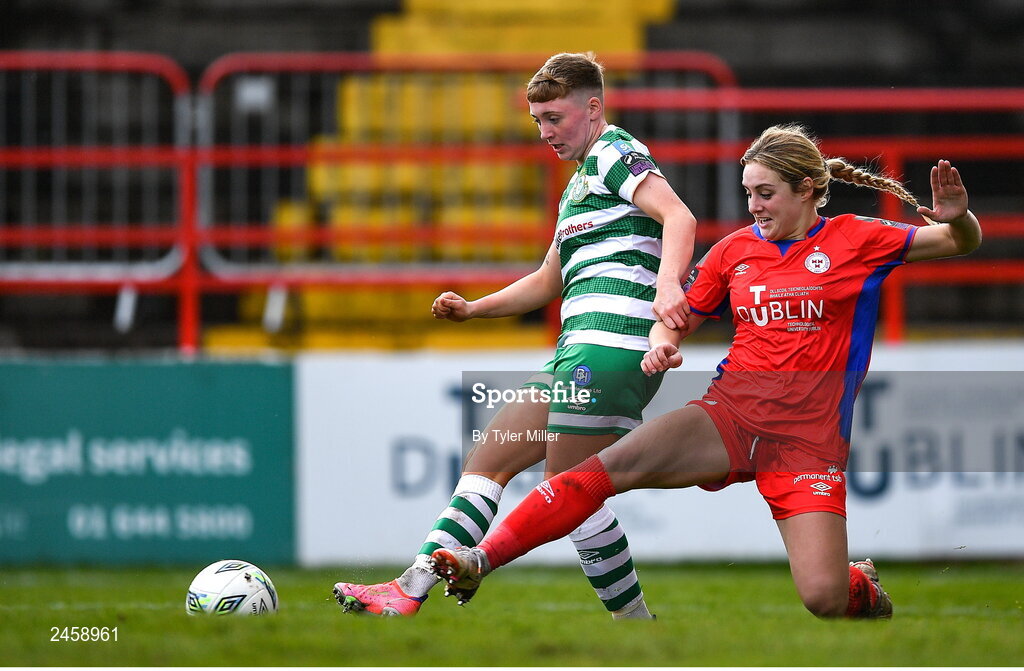 18 March 2023; Jaime Thompson of Shamrock Rovers is tackled by Maggie Pierce of Shelbourne during the SSE Airtricity Women's Premier Division match between Shelbourne and Shamrock Rovers at Tolka Park in Dublin. Photo by Tyler Miller/Sportsfile