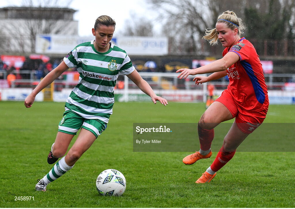 18 March 2023; Abbie Larkin of Shamrock Rovers in action against Jessie Staplton of Shelbourne during the SSE Airtricity Women's Premier Division match between Shelbourne and Shamrock Rovers at Tolka Park in Dublin. Photo by Tyler Miller/Sportsfile