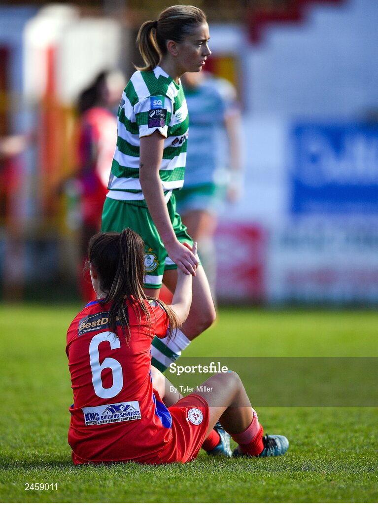 18 March 2023; Alex Kavanagh of Shelbourne and Abbie Larkin of Shamrock Rovers after the SSE Airtricity Women's Premier Division match between Shelbourne and Shamrock Rovers at Tolka Park in Dublin. Photo by Tyler Miller/Sportsfile