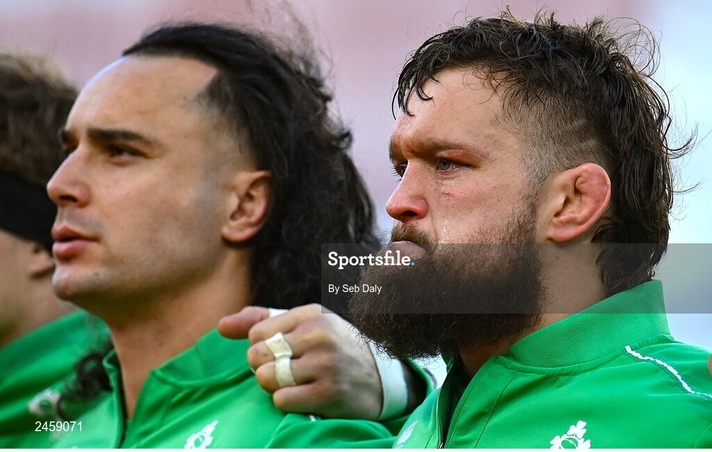 18 March 2023; An emotional Andrew Porter, right, during the national anthems before the Guinness Six Nations Rugby Championship match between Ireland and England at the Aviva Stadium in Dublin. Photo by Seb Daly/Sportsfile