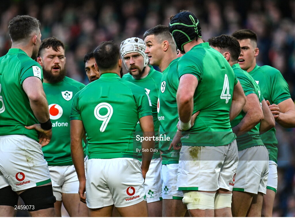 18 March 2023; Jonathan Sexton of Ireland, centre, issues instructions to teammates during the Guinness Six Nations Rugby Championship match between Ireland and England at the Aviva Stadium in Dublin. Photo by Seb Daly/Sportsfile