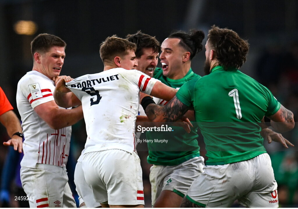 18 March 2023; Andrew Porter of Ireland, right, and teammate James Lowe tussle with Jack van Poortvliet, second from left, and Owen Farrell of England during the Guinness Six Nations Championship match between Ireland and England at Aviva Stadium in Dublin. Photo by Harry Murphy/Sportsfile