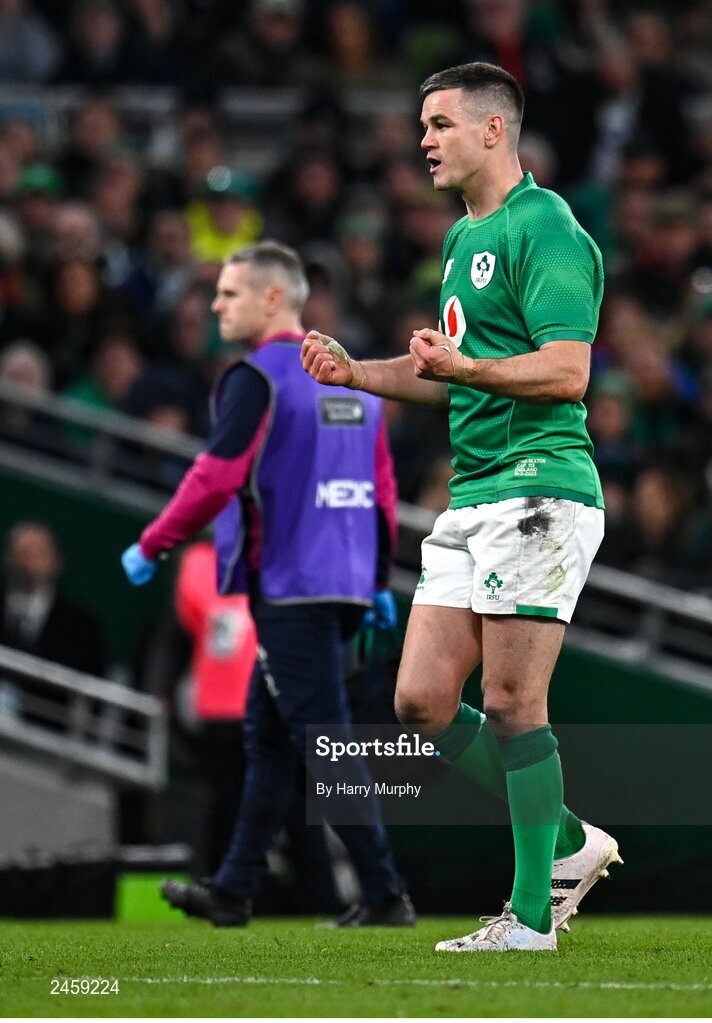 18 March 2023; Jonathan Sexton of Ireland encourages teammates during the Guinness Six Nations Rugby Championship match between Ireland and England at Aviva Stadium in Dublin. Photo by Harry Murphy/Sportsfile