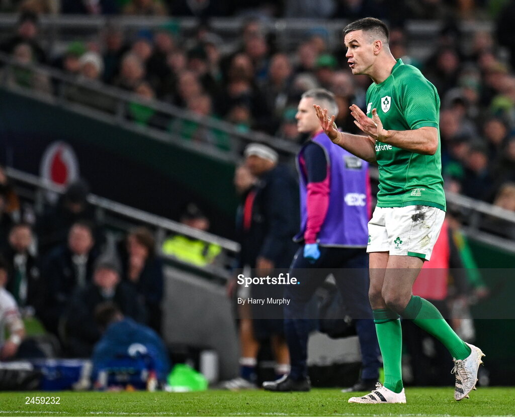 18 March 2023; Jonathan Sexton of Ireland encourages teammates during the Guinness Six Nations Rugby Championship match between Ireland and England at Aviva Stadium in Dublin. Photo by Harry Murphy/Sportsfile