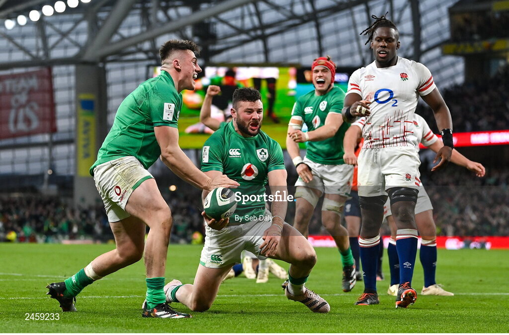18 March 2023; Robbie Henshaw of Ireland, centre, celebrates after scoring his side's second try during the Guinness Six Nations Rugby Championship match between Ireland and England at the Aviva Stadium in Dublin. Photo by Seb Daly/Sportsfile