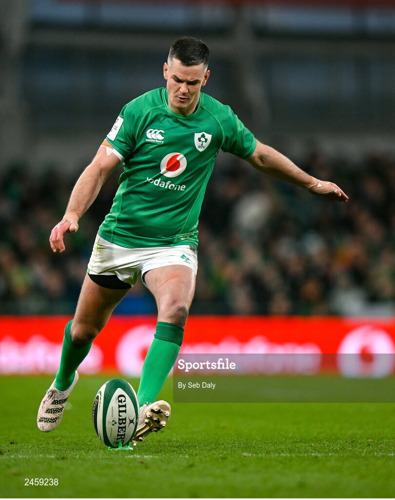 18 March 2023; Jonathan Sexton of Ireland kicks a conversion after his side's second try during the Guinness Six Nations Rugby Championship match between Ireland and England at the Aviva Stadium in Dublin. Photo by Seb Daly/Sportsfile