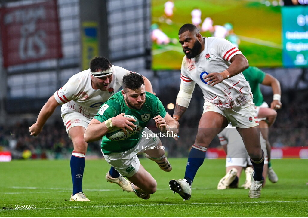 18 March 2023; Robbie Henshaw of Ireland dives over to score his side's second try during the Guinness Six Nations Rugby Championship match between Ireland and England at the Aviva Stadium in Dublin. Photo by Seb Daly/Sportsfile