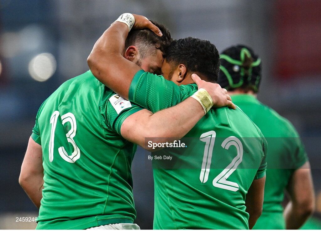 18 March 2023; Robbie Henshaw of Ireland, left, is congratulated by teammate Bundee Aki after scoring his side's second try during the Guinness Six Nations Rugby Championship match between Ireland and England at the Aviva Stadium in Dublin. Photo by Seb Daly/Sportsfile