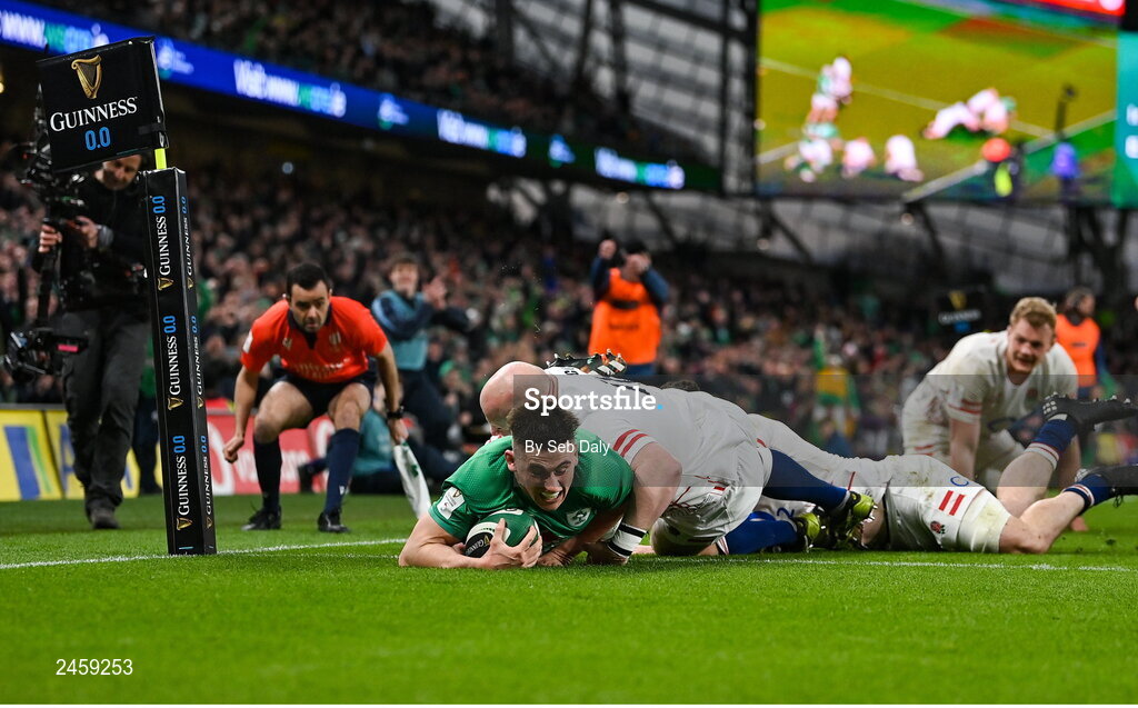18 March 2023; Dan Sheehan of Ireland dives over to score his side's third try despite the tackle of Dan Cole of England during the Guinness Six Nations Rugby Championship match between Ireland and England at the Aviva Stadium in Dublin. Photo by Seb Daly/Sportsfile