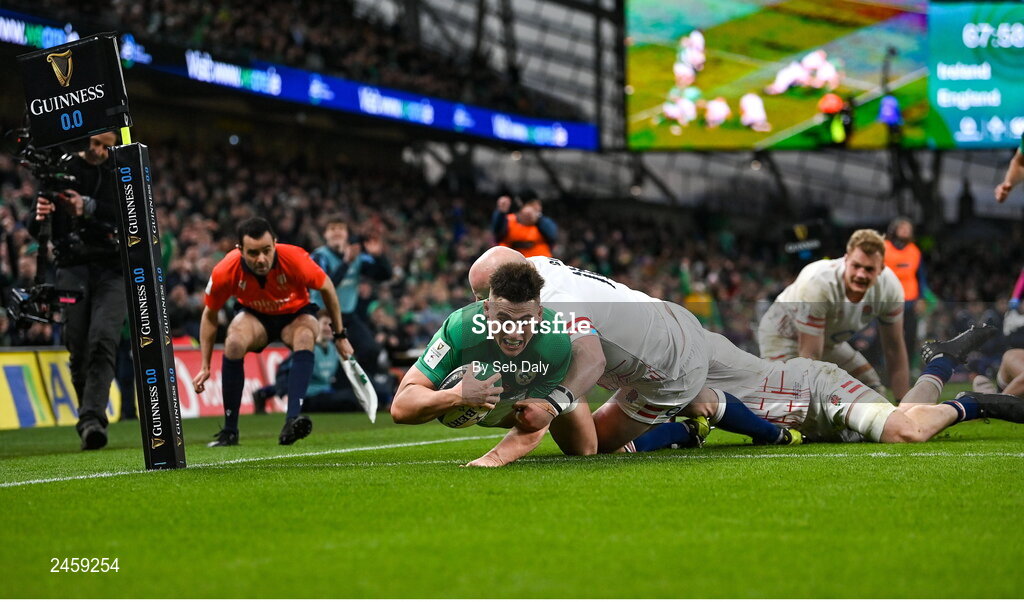 18 March 2023; Dan Sheehan of Ireland dives over to score his side's third try despite the tackle of Dan Cole of England during the Guinness Six Nations Rugby Championship match between Ireland and England at the Aviva Stadium in Dublin. Photo by Seb Daly/Sportsfile