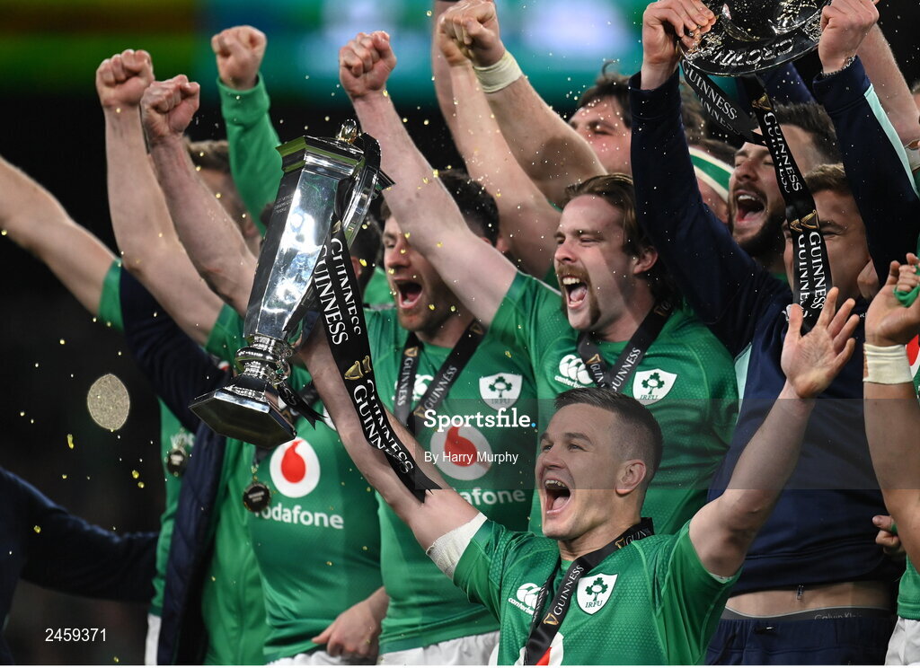 18 March 2023; Jonathan Sexton of Ireland celebrates with the Six Nations trophy after the Guinness Six Nations Rugby Championship match between Ireland and England at Aviva Stadium in Dublin. Photo by Harry Murphy/Sportsfile
