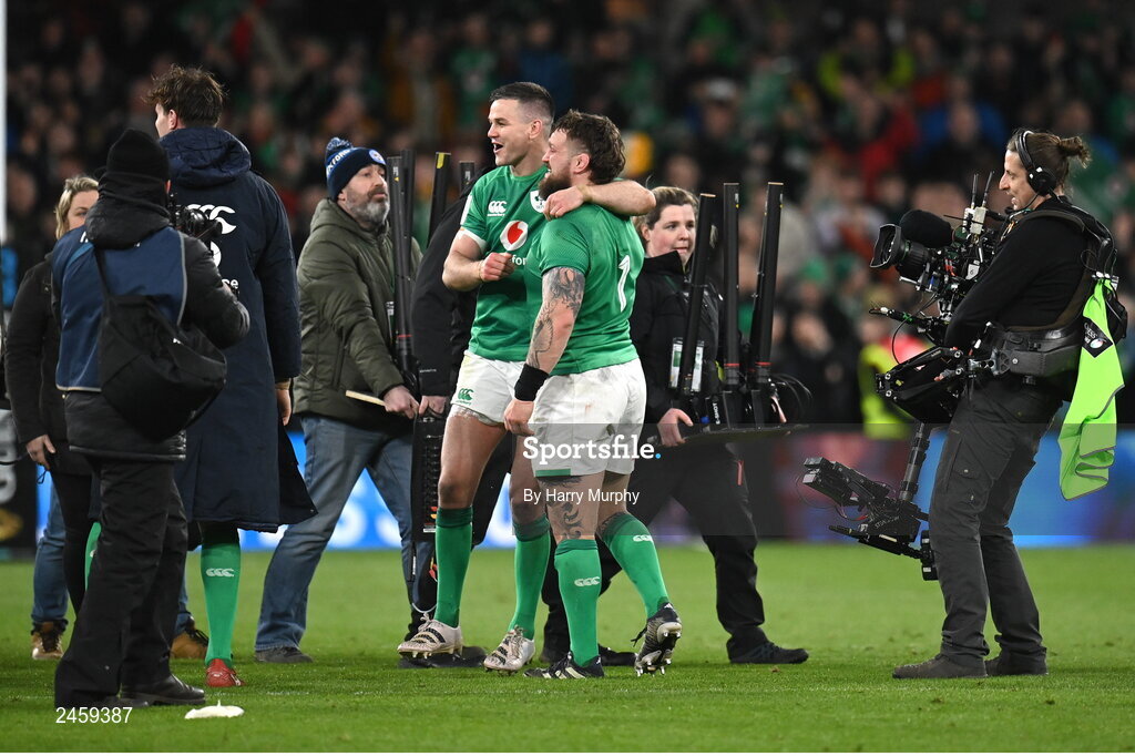 18 March 2023; Jonathan Sexton of Ireland, left, and teammate Andrew Porter celebrate after the Guinness Six Nations Rugby Championship match between Ireland and England at Aviva Stadium in Dublin. Photo by Harry Murphy/Sportsfile