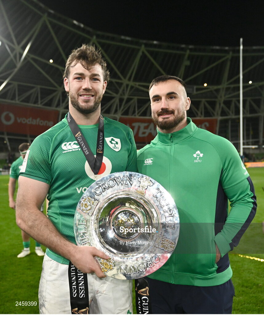18 March 2023; Caelan Doris and Ronan Kelleher of Ireland with triple crown trophy after their side's victory in the Guinness Six Nations Rugby Championship match between Ireland and England at Aviva Stadium in Dublin. Photo by Harry Murphy/Sportsfile