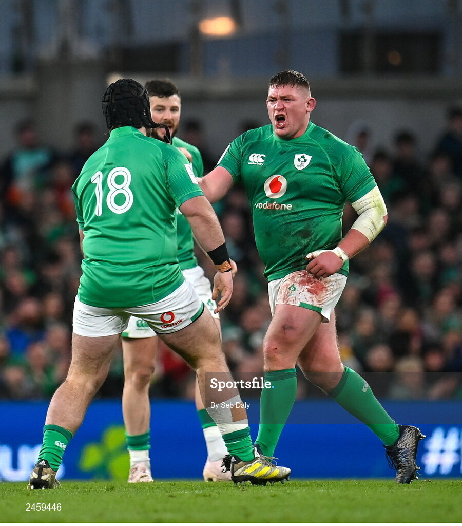 18 March 2023; Tadhg Furlong, right, and Tom O'Toole of Ireland, 18, during the Guinness Six Nations Rugby Championship match between Ireland and England at the Aviva Stadium in Dublin. Photo by Seb Daly/Sportsfile