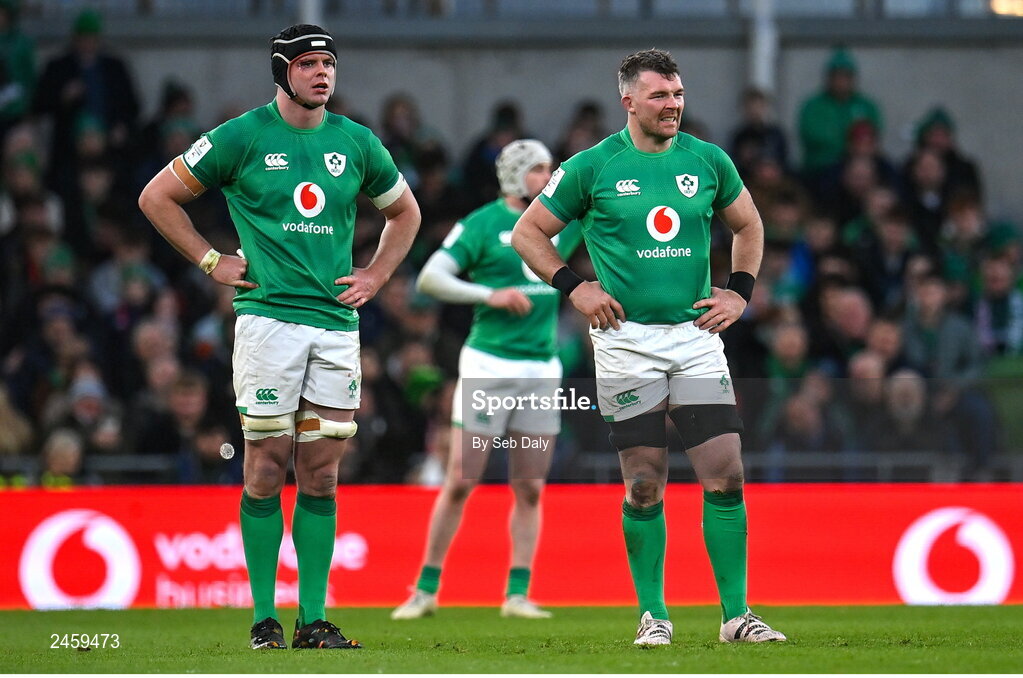 18 March 2023; James Ryan, left, and Peter O'Mahony of Ireland during the Guinness Six Nations Rugby Championship match between Ireland and England at the Aviva Stadium in Dublin. Photo by Seb Daly/Sportsfile