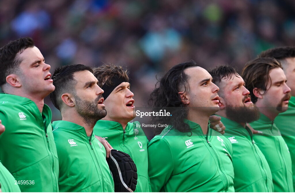 18 March 2023; Ireland players, from left, Tadhg Furlong, James Ryan, Conor Murray, Josh van der Flier, James Lowe, Andrew Porter and Mack Hansen before the Guinness Six Nations Rugby Championship match between Ireland and England at Aviva Stadium in Dublin. Photo by Ramsey Cardy/Sportsfile