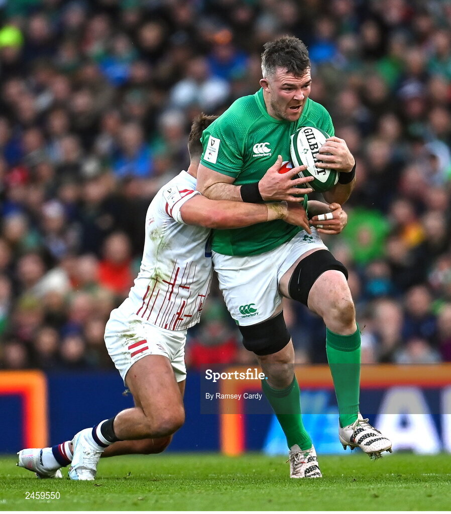 18 March 2023; Peter O'Mahony of Ireland is tackled by Henry Slade of England during the Guinness Six Nations Rugby Championship match between Ireland and England at Aviva Stadium in Dublin. Photo by Ramsey Cardy/Sportsfile