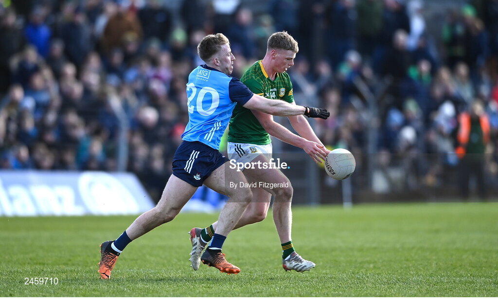 18 March 2023; Mathew Costello of Meath in action against Sean Bugler of Dublin during the Allianz Football League Division 2 match between Meath and Dublin at Páirc Tailteann in Navan, Meath. Photo by David Fitzgerald/Sportsfile