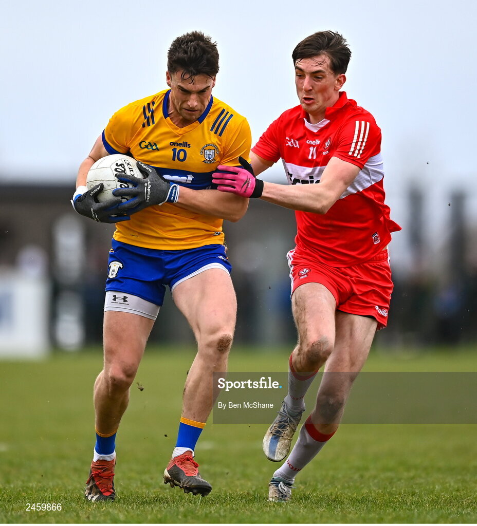 19 March 2023; Jamie Malone of Clare in action against Paul Cassidy of Derry during the Allianz Football League Division 2 match between Derry and Clare at Derry GAA Centre of Excellence in Owenbeg, Derry. Photo by Ben McShane/Sportsfile