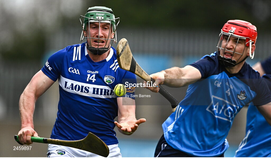19 March 2023; William Dunphy of Laois in action against Paddy Smyth of Dublin during the Allianz Hurling League Division 1 Group B match between Dublin and Laois at Parnell Park in Dublin. Photo by Sam Barnes/Sportsfile