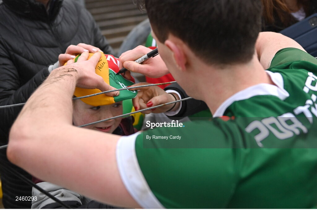 19 March 2023; Diarmuid O'Connor of Mayo signs a hat for Patrick Doocey, age 8, from Belmullet, Mayo, after the Allianz Football League Division 1 match between Donegal and Mayo at MacCumhaill Park in Ballybofey, Donegal. Photo by Ramsey Cardy/Sportsfile