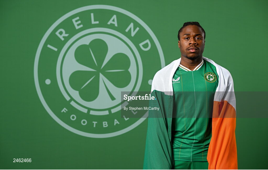 19 March 2023; Michael Obafemi poses for a portrait during a Republic of Ireland squad portrait session at Castleknock Hotel in Dublin. Photo by Stephen McCarthy/Sportsfile