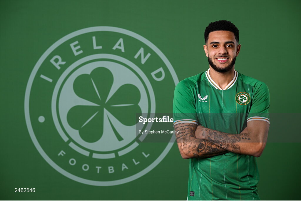 19 March 2023; Andrew Omobamidele poses for a portrait during a Republic of Ireland squad portrait session at Castleknock Hotel in Dublin. Photo by Stephen McCarthy/Sportsfile